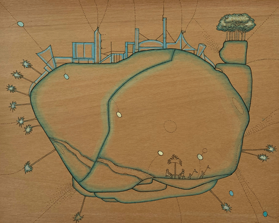 En Ceibal encontramos un lenguaje de trazos que podría parecer simple, pero que revela una complejidad conceptual que dialoga con temas como la expansión urbana, la fragilidad del ecosistema y la persistencia de la naturaleza frente a nuestra intervención en el planeta.