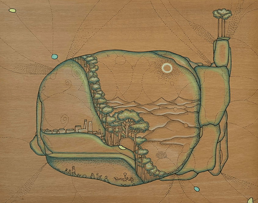 Las figuras humanas que aparecen en el trabajo de Ceibal, en la mayoría de las veces, suelen ser apenas siluetas, trazos diminutos que contrastan con la magnitud del territorio que habitan. Su presencia es casi anecdótica, pero no irrelevante. Introducen una dimensión narrativa que sugiere la amenaza cotidiana de nosotros los humanos hacia nuestros ecosistemas.