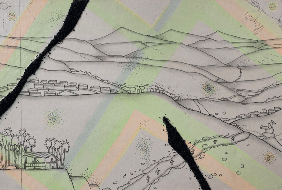Y así en estos espacios que dibuja Ceibal, las montañas se insinúan como ondulaciones, apenas diferenciadas por la variación de color y la densidad del trazo. Evita sobre todo un dramatismo topográfico, pero provoca cuestionar cómo nos expandimos como sociedad, con lo urbano, con lo social, como usurpadores ambientales.