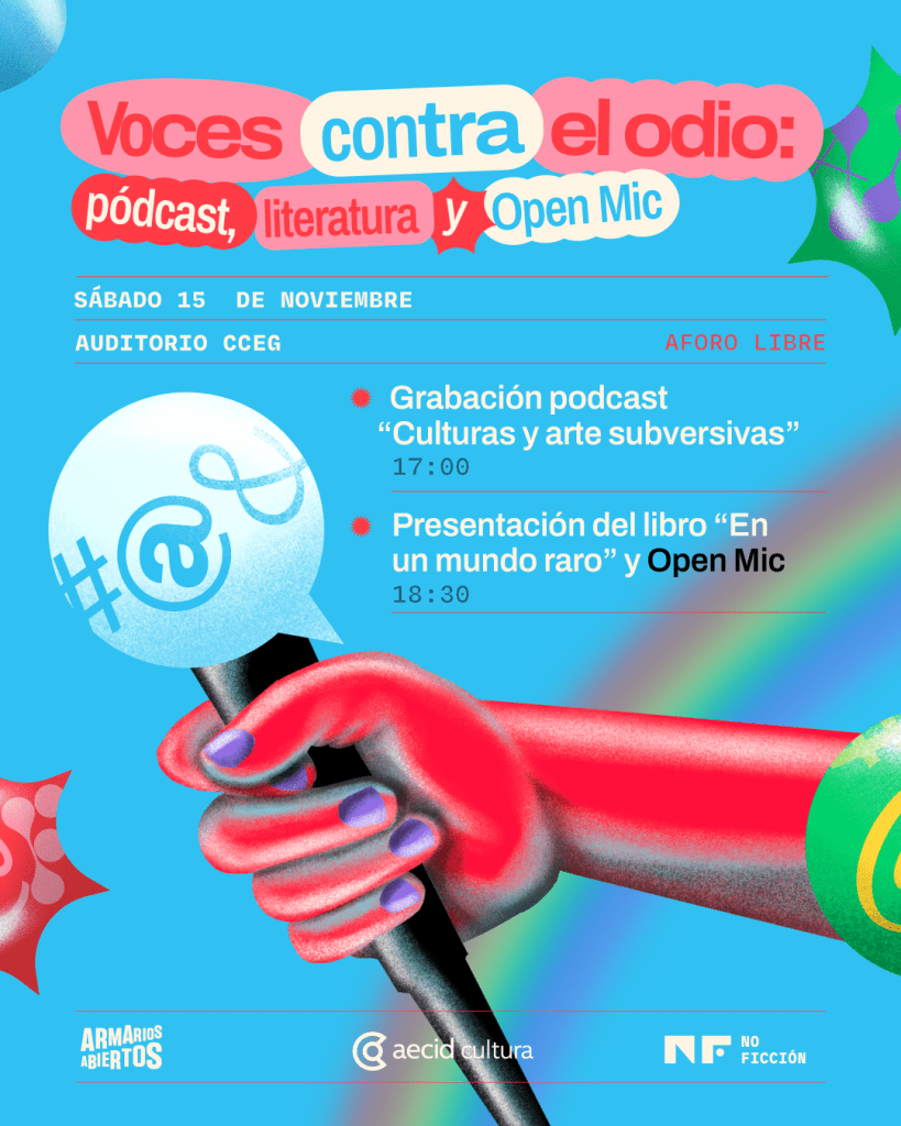 La Red de Centros Culturales de la Agencia Española de Cooperación Internacional para el Desarrollo (AECID) presenta la sexta edición del programa Armarios Abiertos. Un proyecto que contribuye a visibilizar las realidades LGTBIQ+ en Iberoamérica y Guinea Ecuatorial desde la cultura. En el 2025 Armarios Abiertos pone el foco en el preocupante aumento de los discursos de odio contra la comunidad LGTBIQ+, tanto en el espacio político como en la esfera digital; y en el papel esencial de la cultura como herramienta clave para construir narrativas que defiendan los Derechos Humanos de la comunidad LGBTIQ+ y generen argumentos para contrarrestar los discursos de odio.