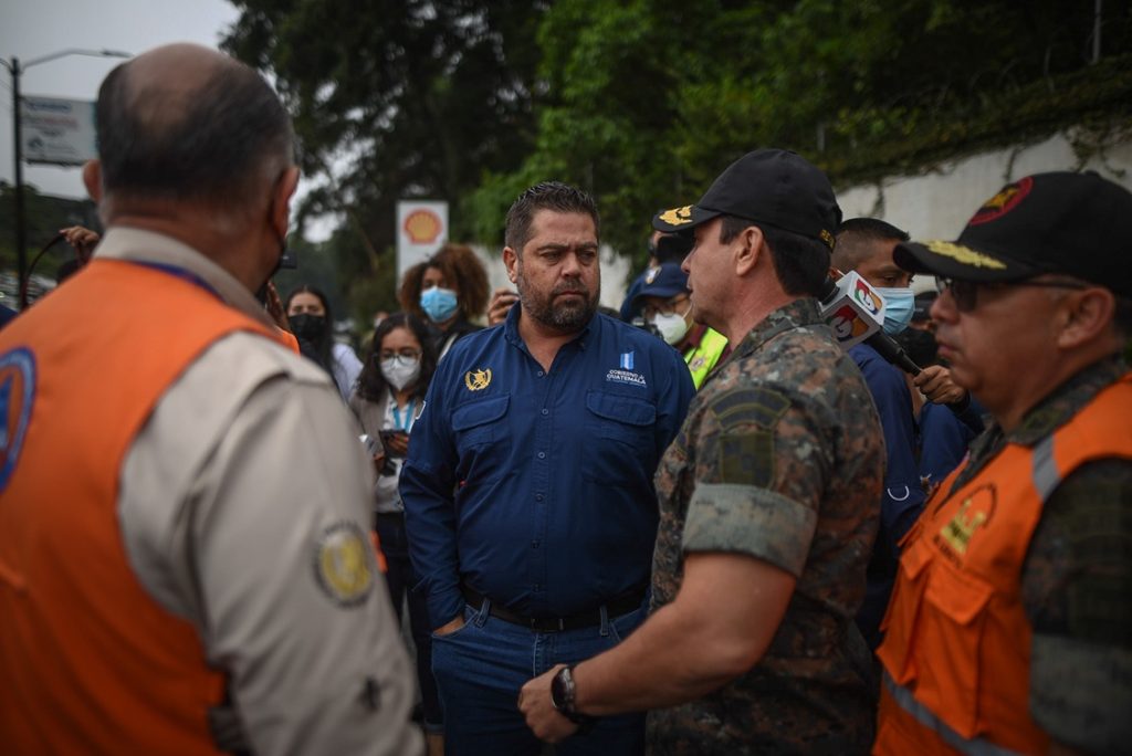 El exministro de Comunicaciones, Javier Maldonado, conversa con personal de Conred, durante el recorrido en un hundimiento en carretera a El Salvador el 22 de septiembre de 2022. Foto/Edwin Bercián.