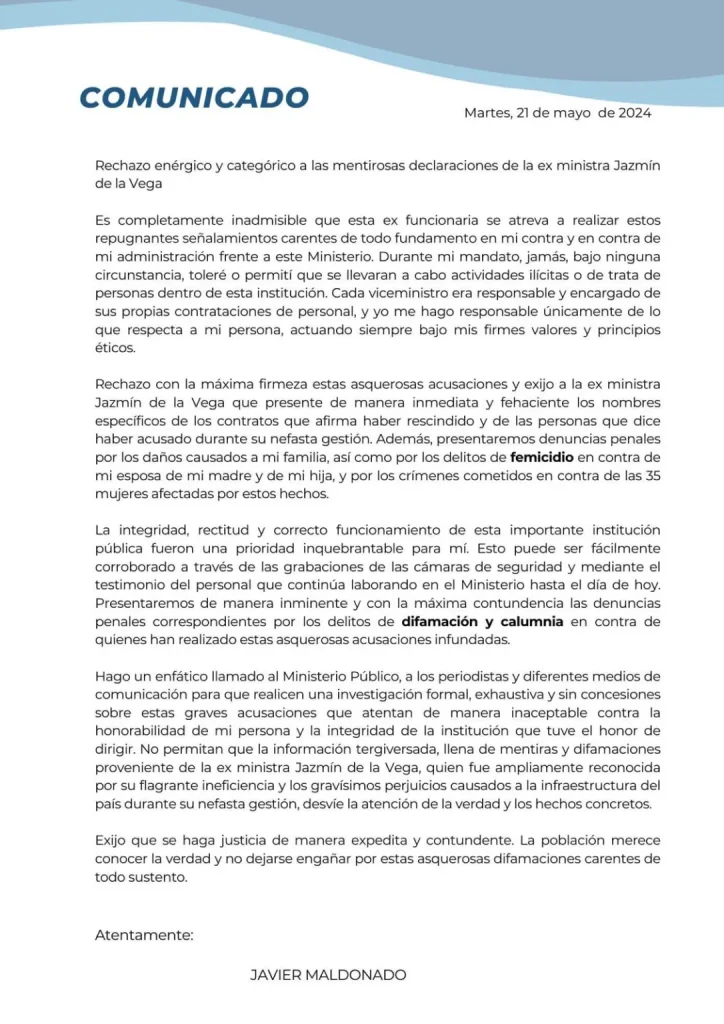 Maldonado emitió un comunicado y negó la existencia de la supuesta red de trata de personas. En su cuenta de X, el exministro reaccionó y acusó a De la Vega de despedir a mujeres inocentes. Lemus, contactado para este reportaje a través de mensaje de texto en WhatsApp, respondió: “prefiero no referirme a ese tema que fue un rumor sin sustento legal, más que todo un distractor en ese momento”.